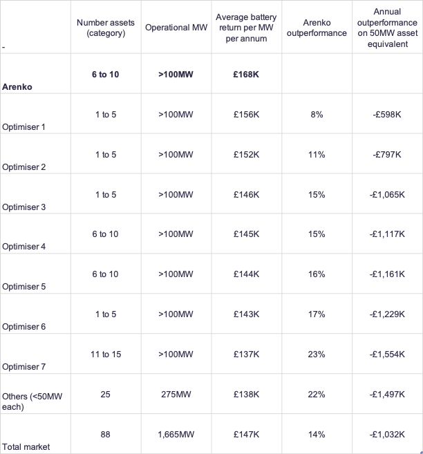 - Assets using Arenko’s technology-led optimisation service capture over £1m excess revenue per annum for every 50MW battery versus market average